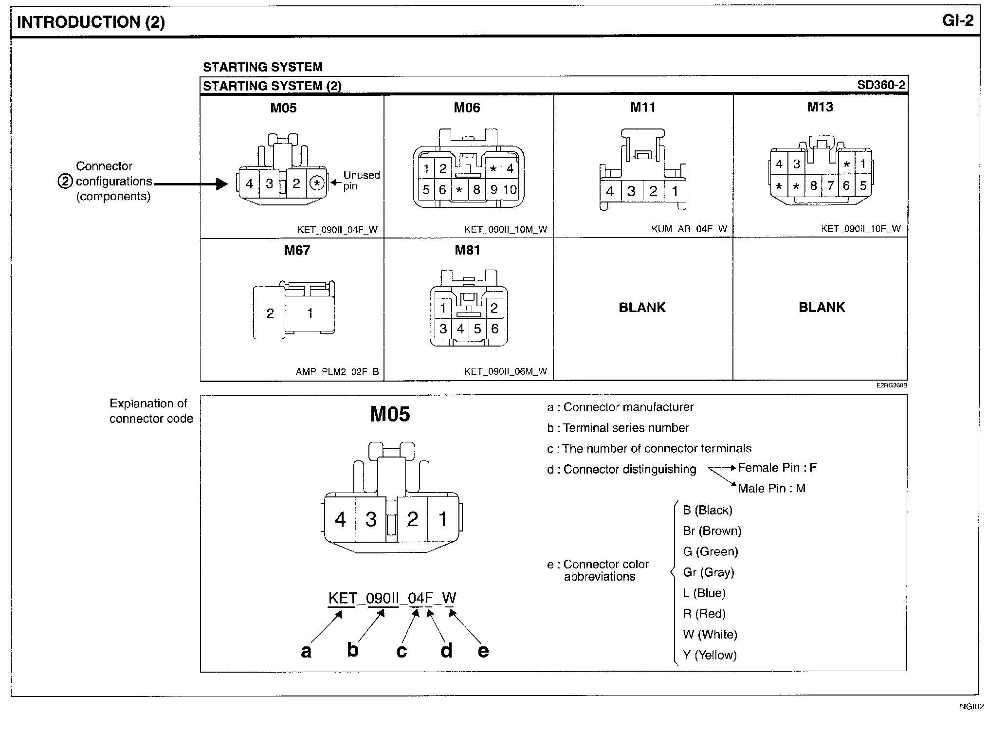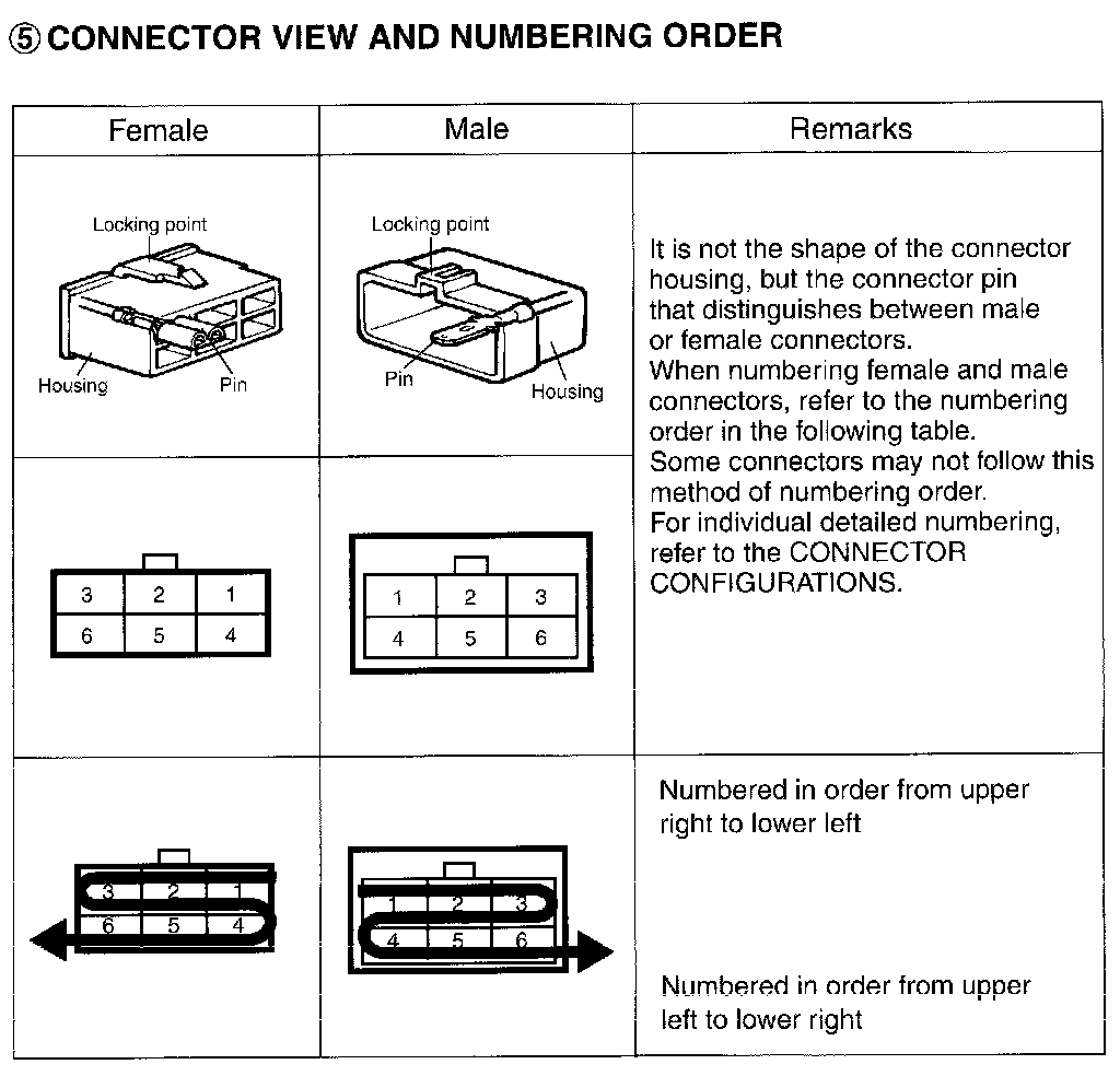 - It shows the front of the connector on the harness side when not to the harness connector. The terminal number on each connector can be obtained by following the pattern used in 05 connector view and numbering order. Unused terminals are marked with an asterisk (*).