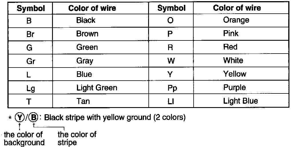 The abbreviations are used to identify wire colors in the circuit schematics.