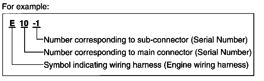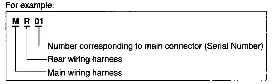 A connector identification symbol consists of a wiring harness location classification symbol corresponding to a wiring harness location and number corresponding to the connector.