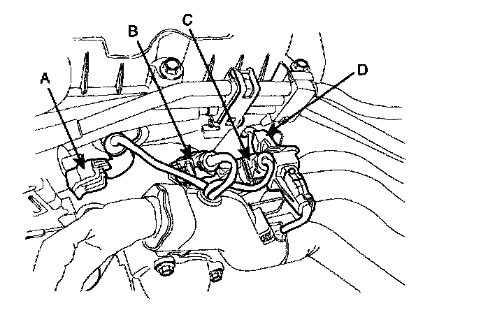 15. Install the PCSV connector (A), WTS connector (B), condenser connector (C), and CKP sensor connector (D).