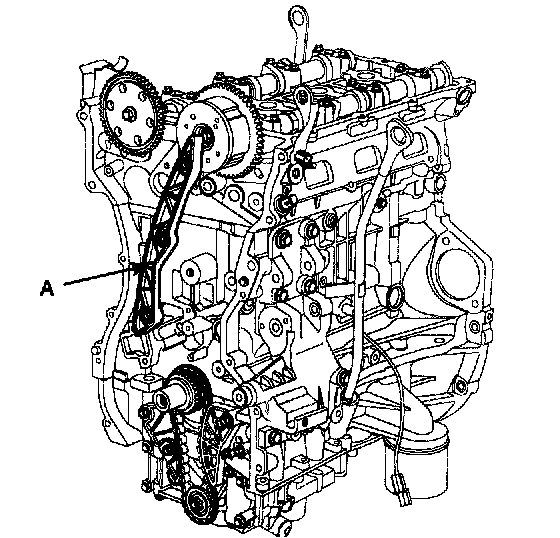 7. Install timing chain auto tensioner (A) and remove set pin.