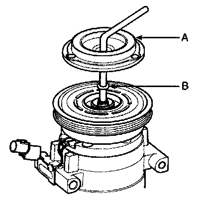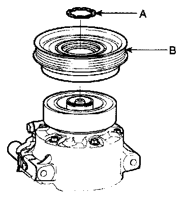 - Be careful not to damage the pulley (B) and compressor during removal/installation.