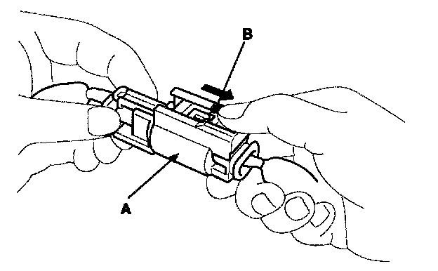 To release the lock, pull the spring-loaded sleeve (A) and the slider (B), while holding the opposite halt of the connector. Pull the connector halves apart. Be sure to pull on the sleeve and not on the connector half.
