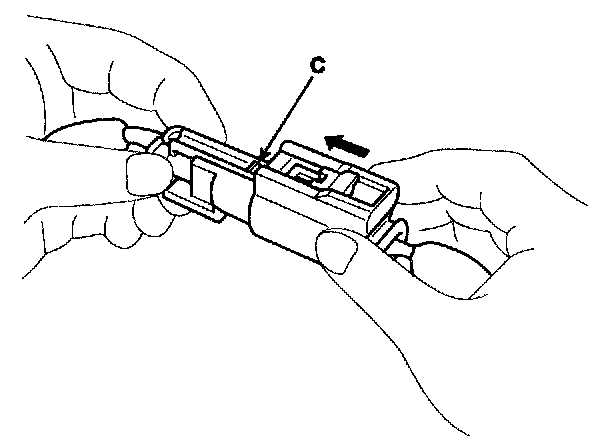 Hold both connector halves and press firmly until the projection (C) of the sleeve-side connector clicks to lock.