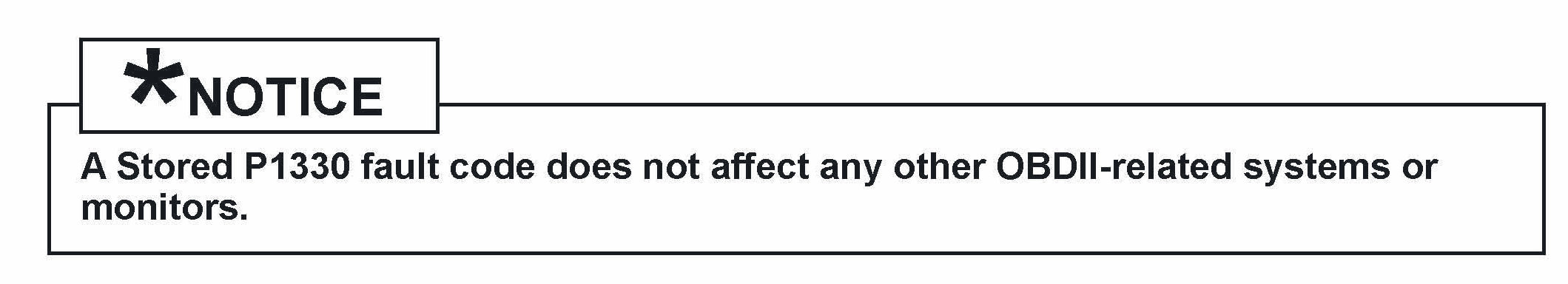 DTC P1330 is intended to be triggered when specific terminals in the Multi-purpose Data Link/Check connector are grounded. When these terminals are grounded a default control mode is temporarily activated in which the spark timing is fixed. This function is intended to only be used during certain checks on the vehicle assembly line. To ensure that vehicles do not leave the assembly plant in this (spark timing fixed) condition a P1330 DTC will set and illuminate the MIL whenever this function is active. However reports from in-use vehicles have indicated that the same condition can occur when these terminals and/or associated wiring are shorted to ground as a result of an electrical fault thus setting the P1330 code and illuminating the MIL.