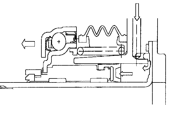 When the clutch pedal is pressed, oil pressure is, transmitted along the arrow directions shown and that moves the clutch slave cylinder and the diaphragm spring of the clutch cover.