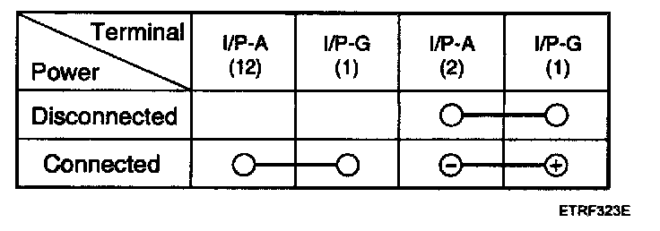 5. There should be no continuity between the No.1 terminal in the I/P-G connector and No.12 terminal in the I/P-A connector when power is disconnected.