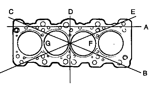 3. Check the cylinder head gasket surface for flatness by using a straight edge in the direction of A, B, ... as shown. If flatness exceeds service limit in any direction, either replace the cylinder head, or lightly machine the cylinder head gasket surface.