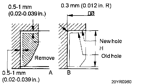 1. Any valve seat insert that has been worn over the service limit should be removed at normal temperature after cutting away most of the insert wall using valve seat cutters as shown in Fig. "A".
