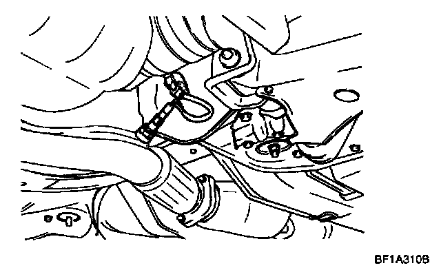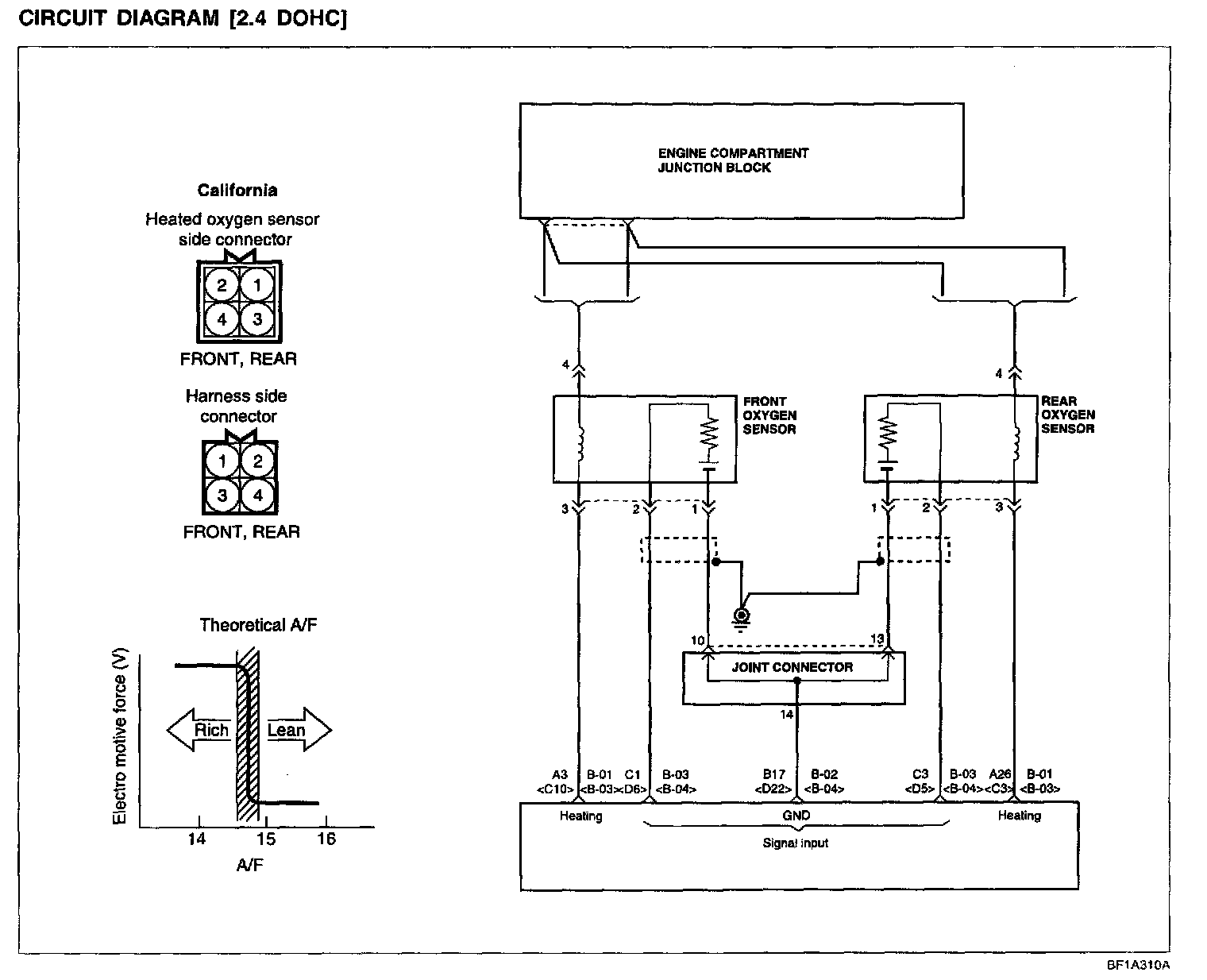 The heated oxygen sensor senses the oxygen concentration in exhaust gas, converts it into a voltage, which is sent to the ECM. The oxygen sensor outputs about 1 V when the air fuel ratio is richer than the theoretical ratio, and outputs about 0 V when the ratio is leaner (higher oxygen concentration in exhaust gas). The ECM controls the fuel injection ratio based on this signal so that the air fuel ratio is maintained at the theoretical ratio. The oxygen sensor has a heater element which ensures the sensor performance during all driving conditions.