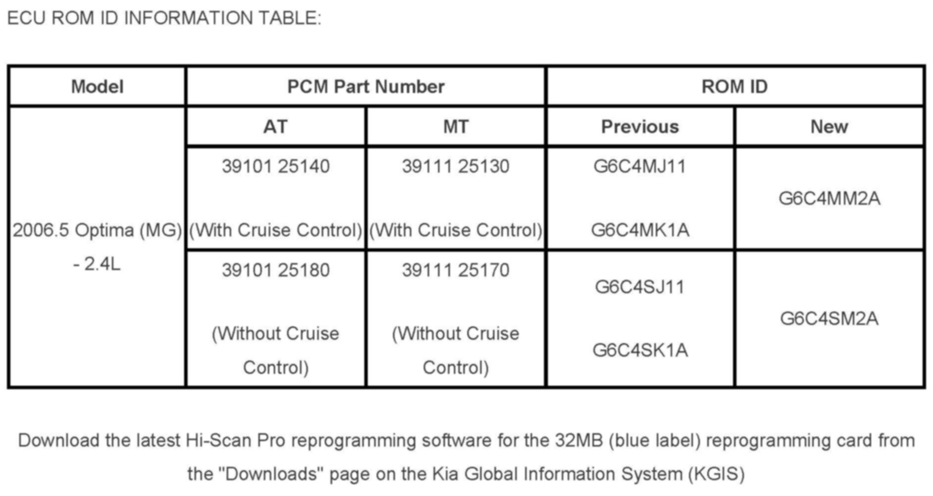 1. Install the Hi-scan tool and verify version of PCM ROM ID before attempting to reflash the PCM. Refer to ECU ROM ID INFORMATION TABLE.