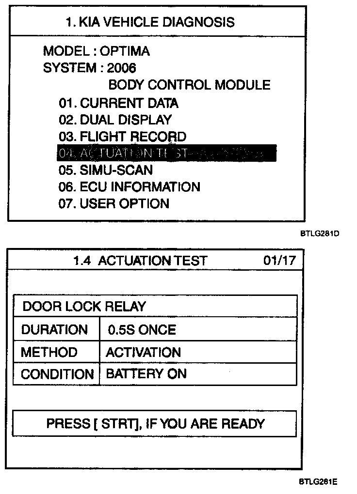 4. To check the Input Value of door lock switch in force mode, select option "04. ACTUATION TEST".