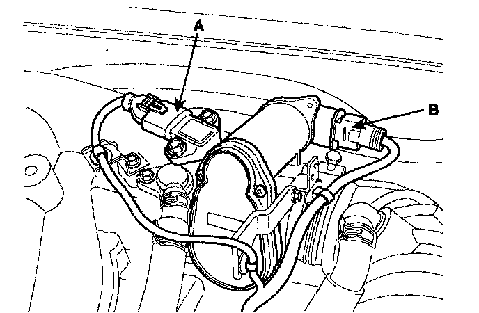 4) Connect the generator connector (A) and the air conditioning compressor connector (B).