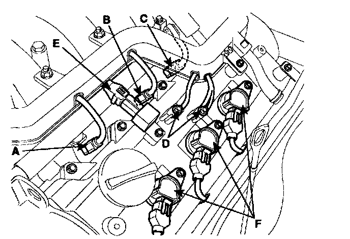 7) Connect the injection connectors (A, B, C), the ground lines (D), the condenser connector (E) and the Ignition coil connectors (F).