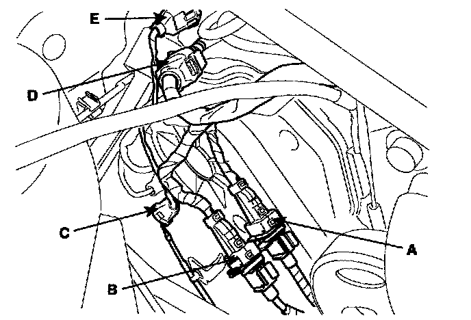 6) Connect the injection harness connector (A), the No.2 VIS (Variable Induction System) connector (B), the No.1/No.2 OCV (Oil Control Valve) connectors (C, D) and the OTS (Oil Temperature Sensor) connector (E).