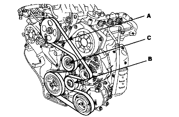 4. Remove the drive belt (A), the idler (B) and the tensioner (C).