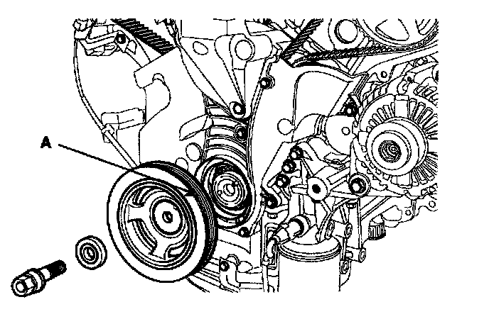 8. Remove the crankshaft damper pulley (A).