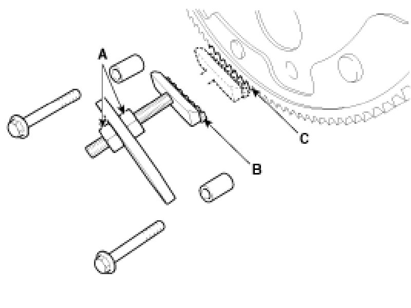 3. Adjust the length of the holder nuts (A) so that the front plate of the holder (B) puts in the ring gear (C) teeth.