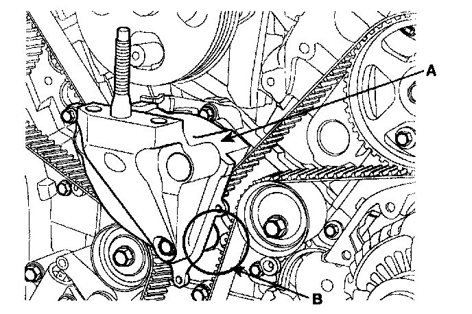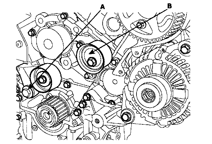 2. Install the tensioner arm assembly(A) and the idler(B).
