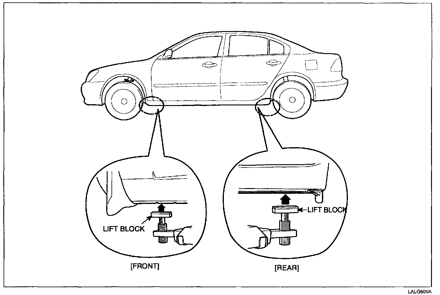 LIFT AND SUPPORT POINTSWARNING: When heavy rear components such as suspension, fuel tank, spare tire, tailgate and trunk lid are to be removed, place additional weight in the luggage area before hoisting. When substantial weight is removed from the rear of the vehicle, the center of gravity may change and can cause the vehicle to tip forward on the hoist.