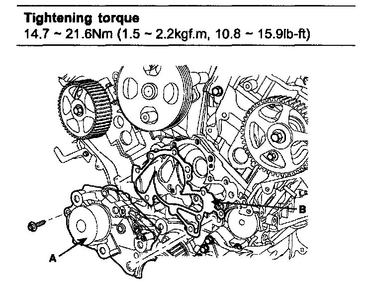 Install the water pump (A) and a new gasket (B) with the bolts.