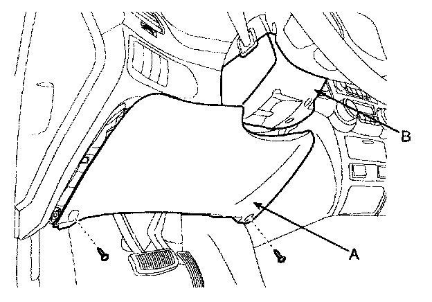 2. Remove the driver lower crash pad panel (A) and shroud lower panel (B).