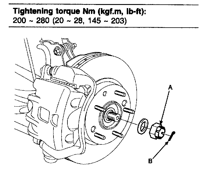 4. Remove the split pin (B), castle nut (A) and washer from the front hub assembly.
