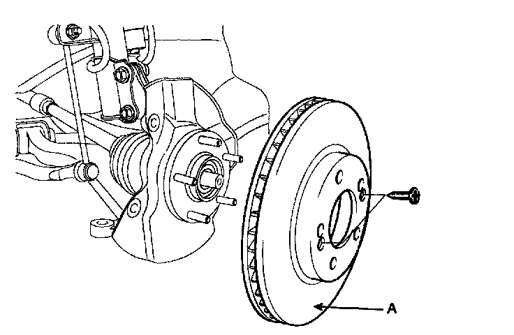 8. Loosen the screws and remove the brake disc (A) from the front hub assembly.