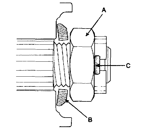 CAUTION: The washer (B) should be assembled with convex surface outward when installing the castle (A) nut and split pin (C).