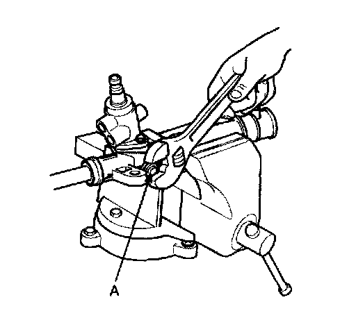 13. With the rack placed in the center position, attach the yoke plug to the rack housing. Tighten the yoke plug to 12 Nm (120 kg-cm, 8.9 ft. lbs.), with a 14 mm socket (A). Loosen the yoke plug approximately from 30° to 60° and tighten the yoke nut to the specified torque.