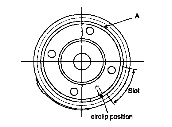 13. When the end of the circlip comes out of the notched hole of the housing rack cylinder, turn the rack stopper (A) clockwise and remove the circlip.