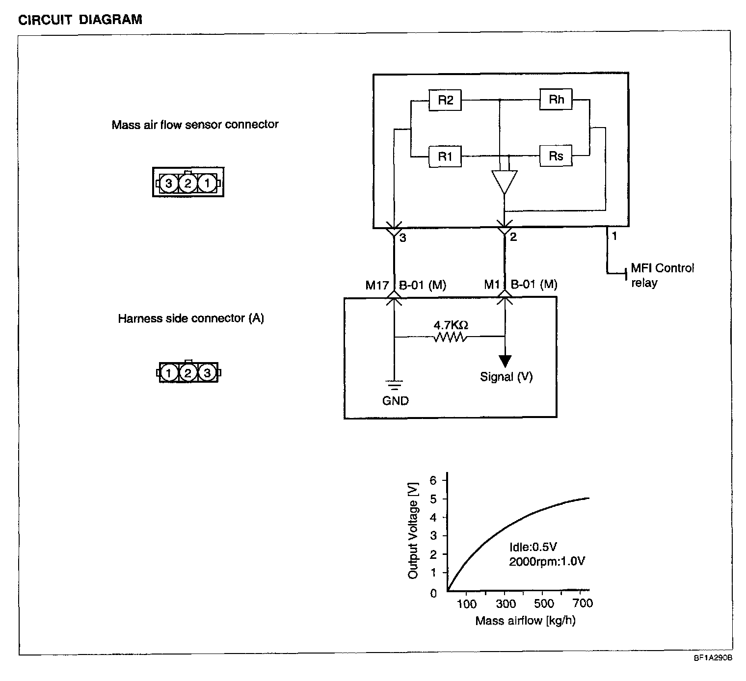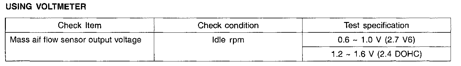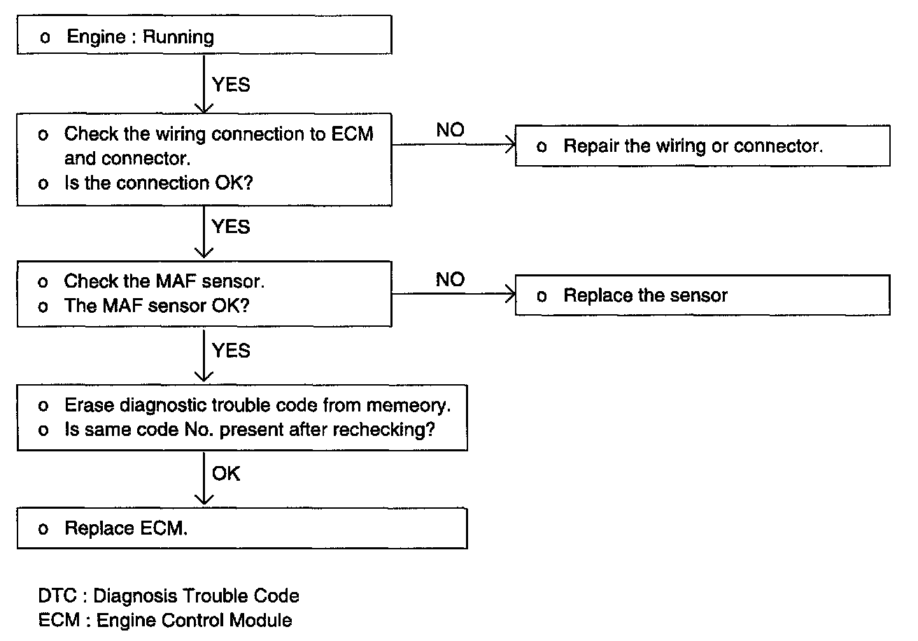 2. If the MAF sensor output voltage is other than 0 when the ignition switch is turned on (do not start the engine). Check for the faulty MAF sensor or ECM.