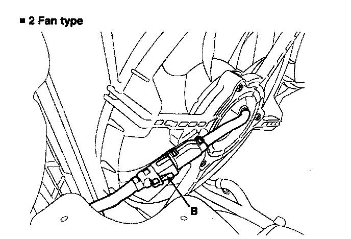 Check that the radiator fan rotates when battery voltage is applied between (+) and (-) terminals.