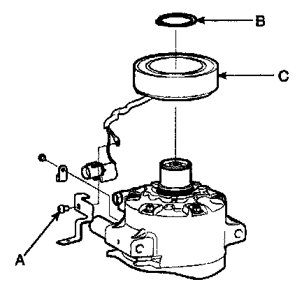 4. Remove the screw (A) from the field coil ground terminal. Remove the retainer ring (B) and then remove the field coil (C) from the shaft with a puller. Be careful not to damage the coil and compressor.