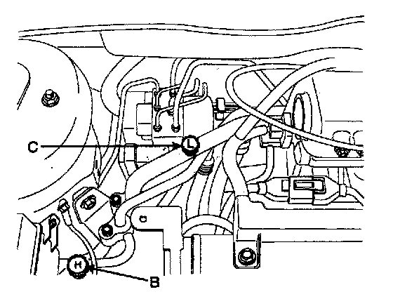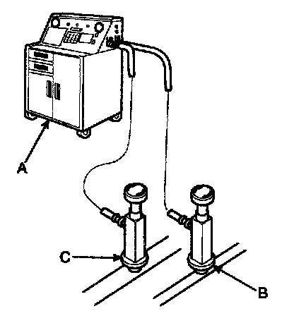 1. Connect an R-134a refrigerant Recovery/Recycling/Charging System (A) to the high-pressure service port (B) and the low-pressure service port (C) as shown, following the equipment manufacturer's instructions.