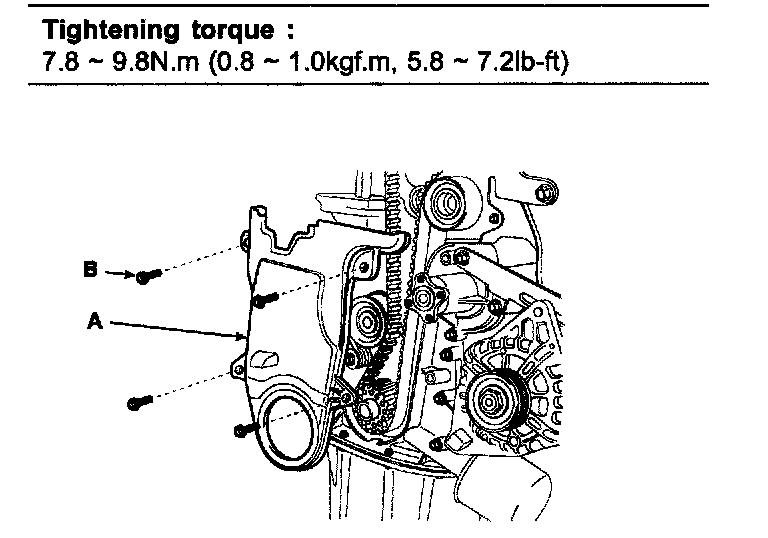 3) After checking the alignment between each sprocket and each timing belt tooth, tighten the mounting bolt (A) and (B) one by one.