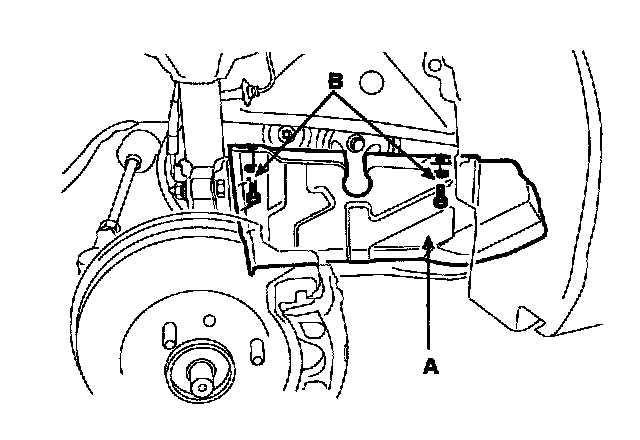 13. Remove the 4 bolts (B) and timing belt lower cover (A).
