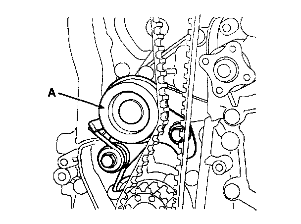 14. Remove the timing belt tensioner (A) and timing belt.