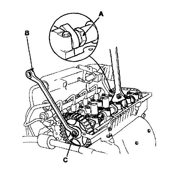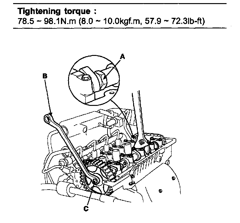 2) Hold the portion (A) of the camshaft with a hexagonal wrench, and tighten the bolt (C) with a wrench (B).