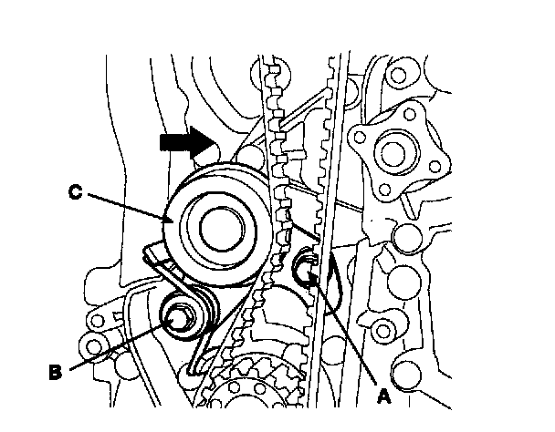 15. Remove the bolt (B) and the timing belt idler (A).