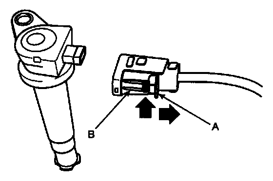 NOTE: When removing the ignition coil connector, pull the lock pin (A) and push the clip (B).