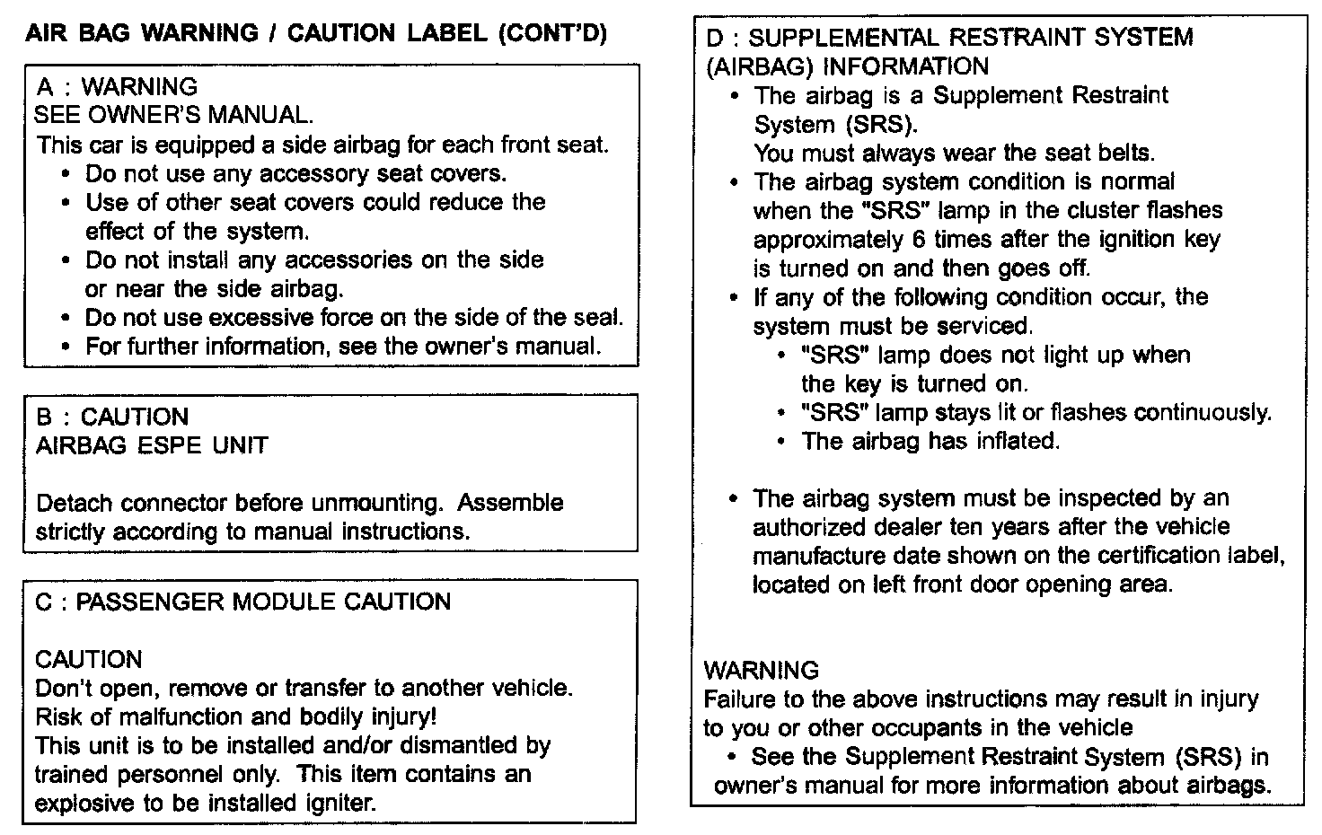 Air Bag Warning / Caution Label (Continued):