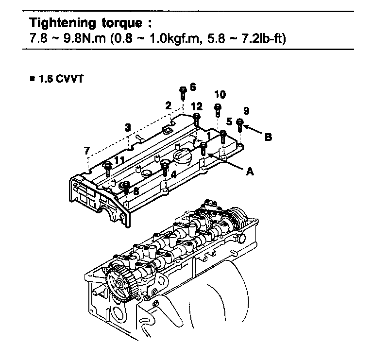 Install the cylinder head cover (A) with bolts (B). Uniformly tighten the bolts in several passes. Pre-tighten all bolts by 3.9 - 4.9 Nm (0.4 - 0.5 kgf.m, 2.9 - 3.6 ft. lbs.) and then tighten by the specified torque.