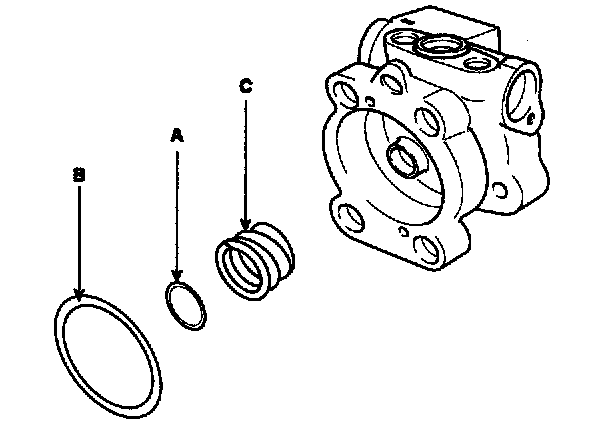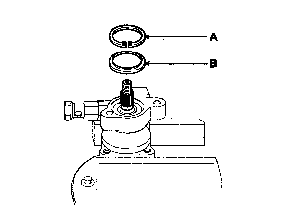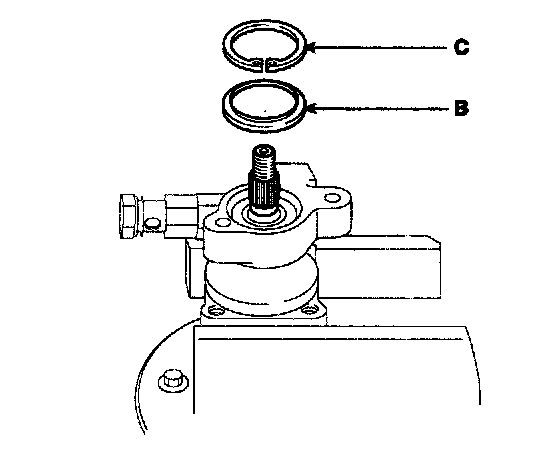3. After inserting the shaft assembly (A) into the pump body, install the dust spacer (B) and snap ring (C).