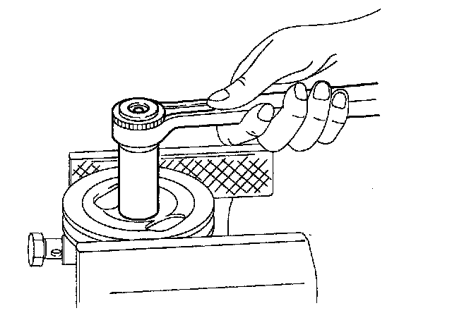 8. Mount the pulley in a vise and remove the pulley nut and the spring washer.