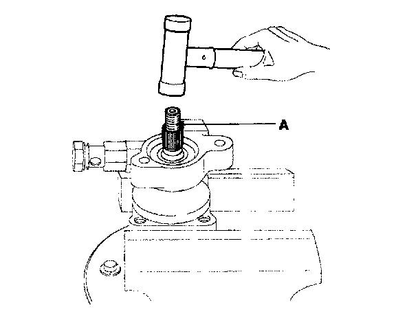 11. Tap the rotor side of the shaft slightly with a plastic hammer (A) to remove the shaft (B).