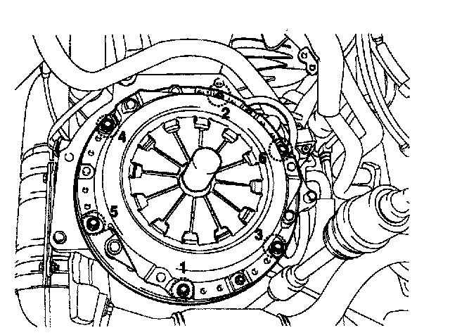 3. Install the clutch cover assembly to the flywheel and temporarily tighten the bolts one or two steps at a time in a star pattern.