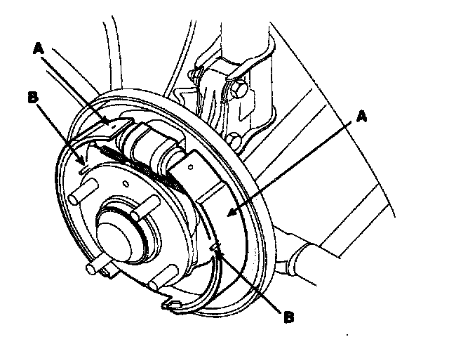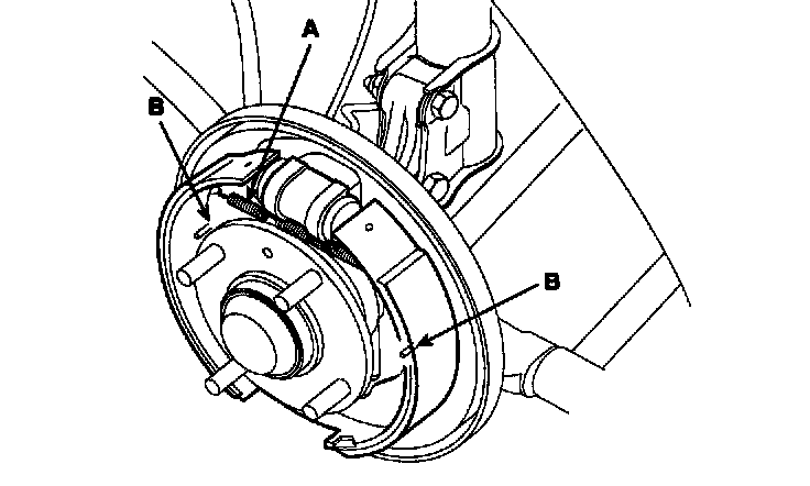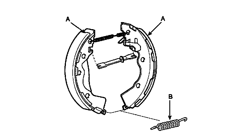 3. Lower the brake shoe assembly (A), and remove the lower return spring (B). Make sure not to damage the dust cover on the wheel cylinder.