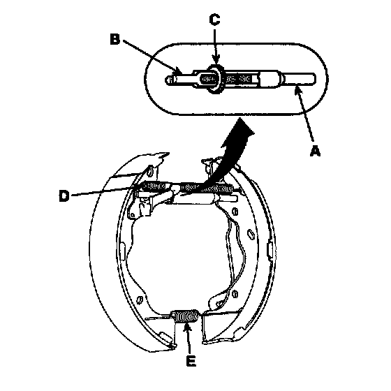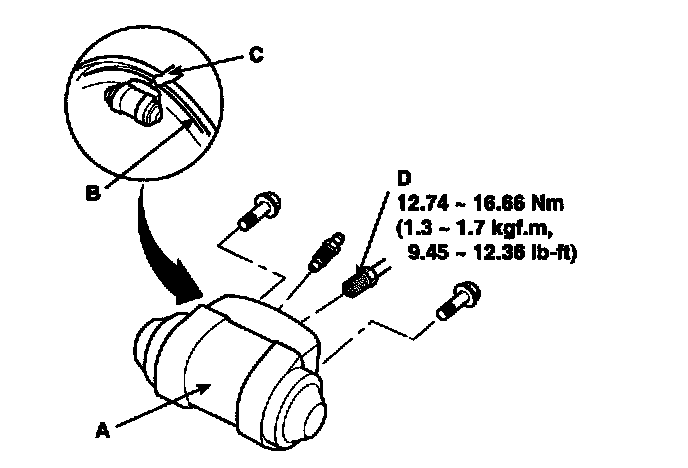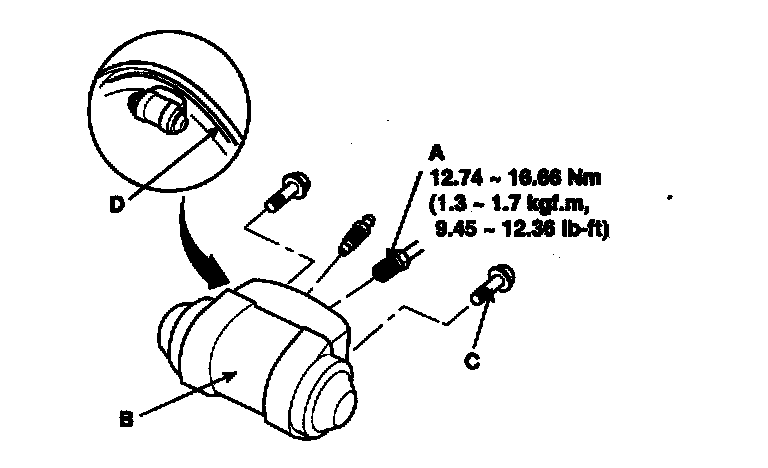7. Remove the bolt (C) and the wheel cylinder (B) from the backing plate (D).