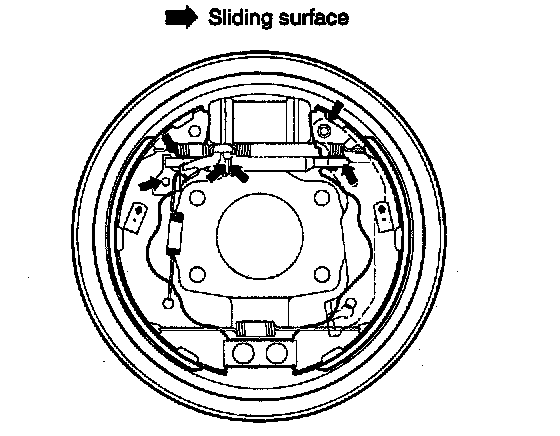 8. Apply brake cylinder grease or equivalent rubber grease to the sliding surfaces shown. Don't get grease on the brake linings.